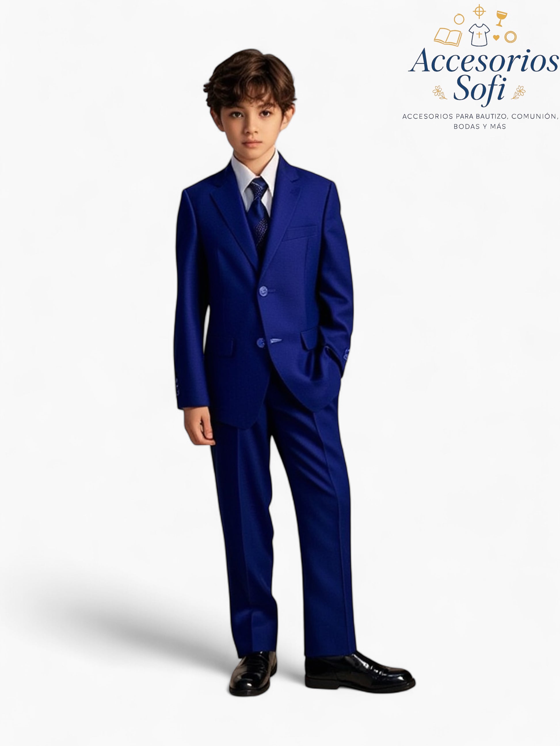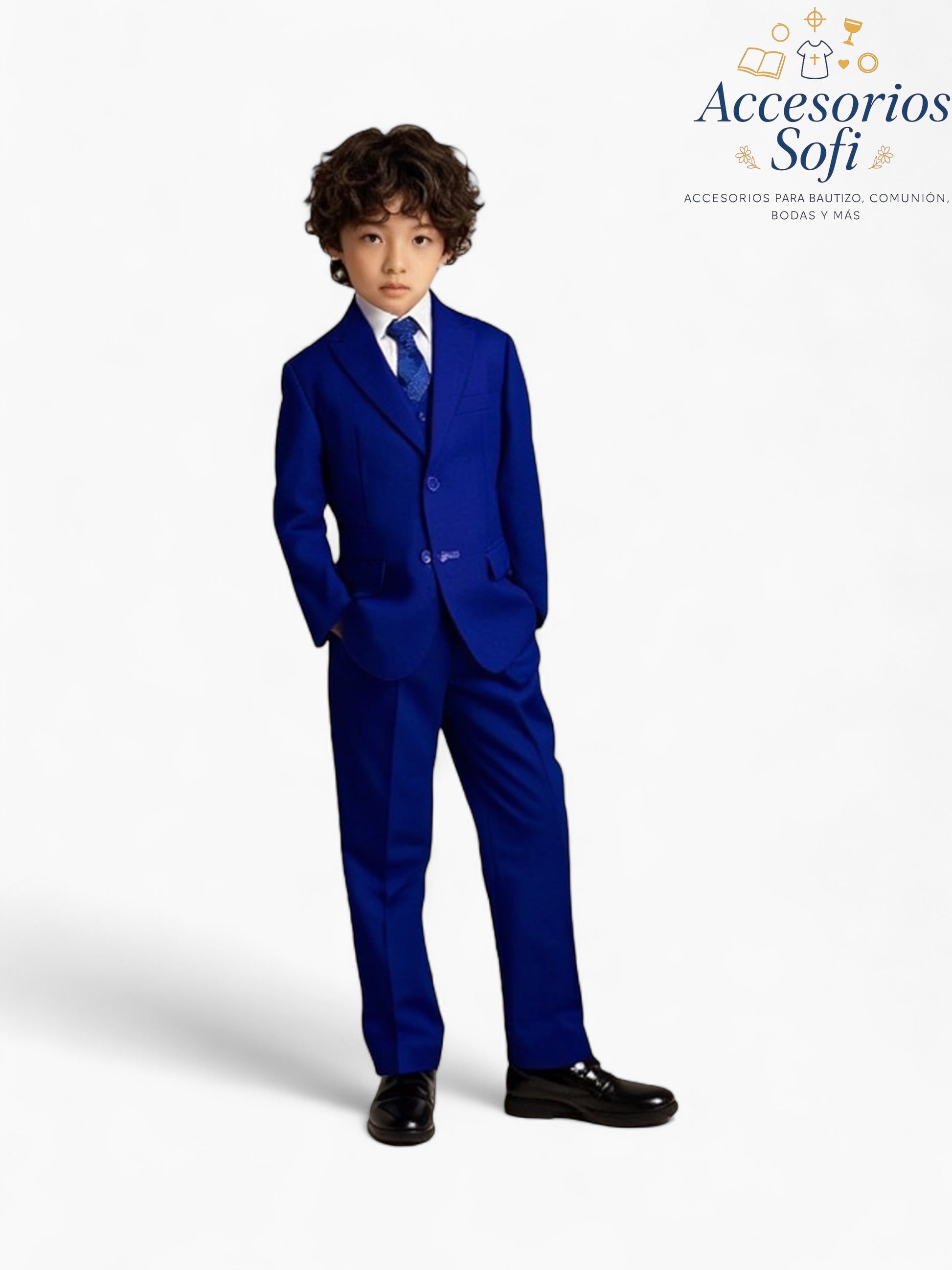 Este impactante traje azul rey para niño es ideal para eventos importantes como comuniones, bodas, presentaciones, sesiones fotográficas y ceremonias religiosas.